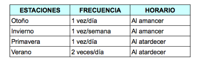 - AGUA: todo huerto urbano necesita de un buen sistema de riego para mantener una humedad constante. Según la época del año nuestras plantas necesitaran mas o menos agua. En esta tabla podéis tomar algunas referencias sobre la frecuencia de riego: