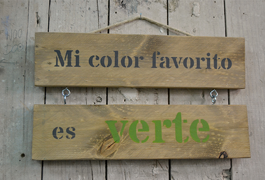 Haz tu propio cartel decorativo en madera recuperada con tu frase favorita (4 para elegir): «A besos entiendo», «Mi color favorito es VERTE», «Lo que sea, pero contigo», » Yo que tu, lo intentaba conmigo».